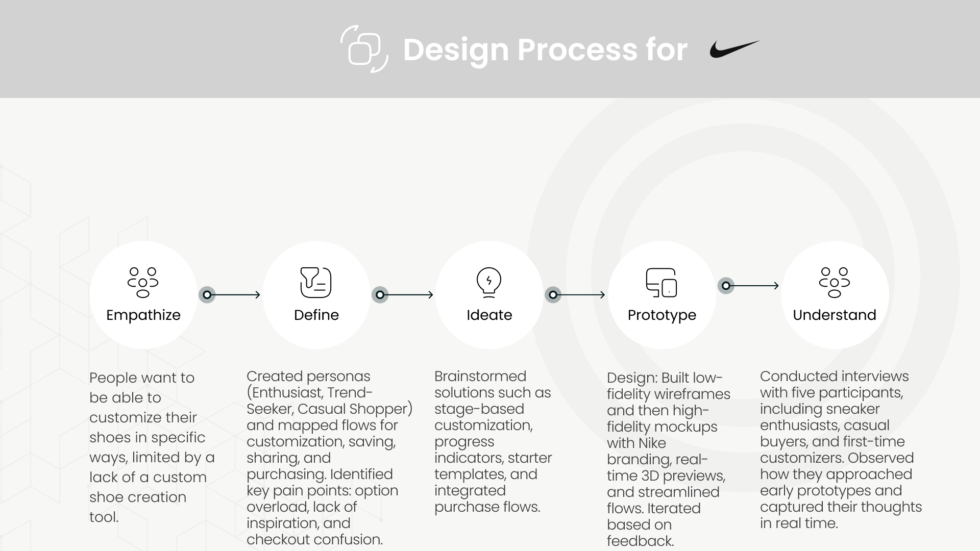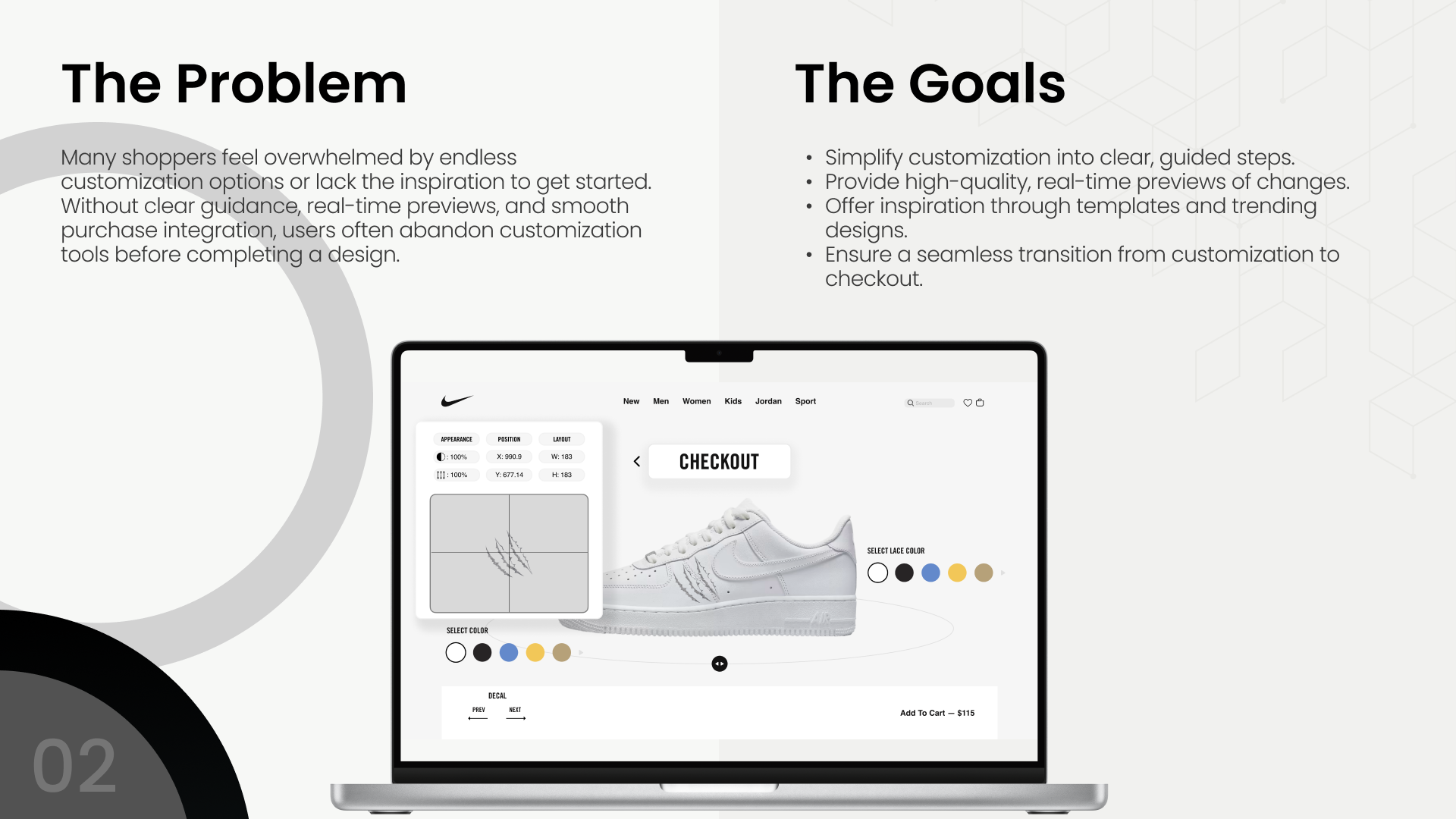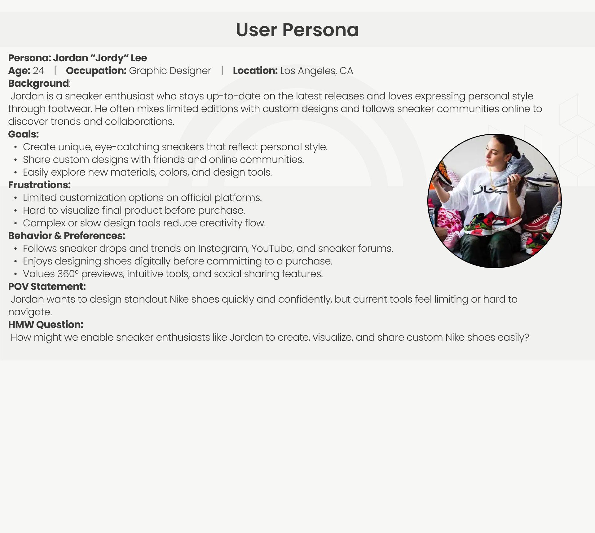 Nike Shoe Customization ConceptBy Ethan Ramm Link here:https://www.figma.com/board/ppTBUlxHOkKfceQJSJThEo/Untitled?node-id=0-1&t=GeKaLxmHC4wCK9Qm-1 Link to file:https://www.figma.com/board/WKmdDPrzfyBkFq4780os2d/Untitled?node-id=0-1&t=rHGAC03Z18vvWU7V-1 Link to file:https://www.figma.com/design/beScEZ1AGYBl6nvwOp8gA9/Untitled?node-id=0-1&t=7WAFzX31gFiudBXX-1 Link to prototype:https://www.figma.com/proto/beScEZ1AGYBl6nvwOp8gA9/Untitled?node-id=0-1&t=7WAFzX31gFiudBXX-1